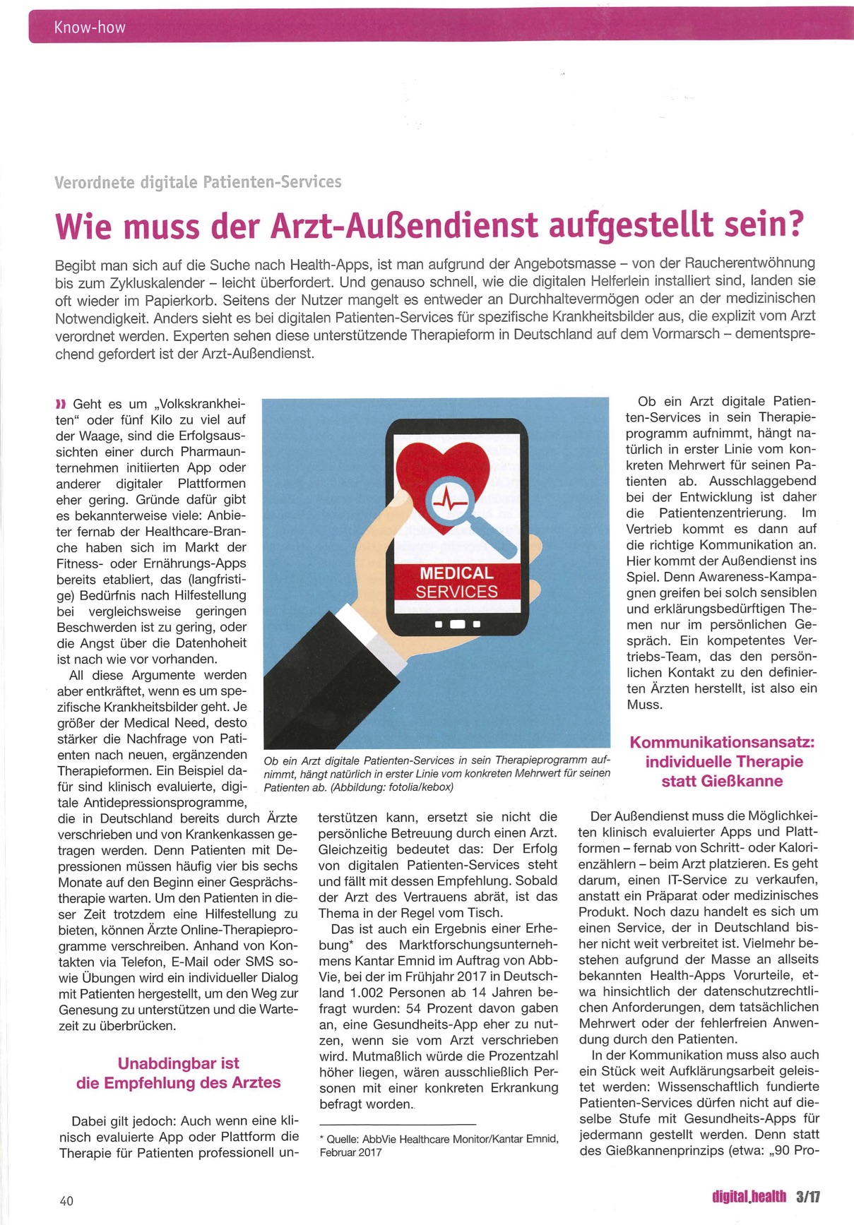 Begibt man sich auf die Suche nach Health-Apps, ist man aufgrund der Angebotsmasse – von der Raucherentwöhnung bis zum Zykluskalender – leicht überfordert. Und genauso schnell, wie die digitalen Helferlein installiert sind, landen sie oft wieder im Papierkorb. Seitens der Nutzer mangelt es entweder an Durchhaltevermögen oder an der medizinischen Notwendigkeit. Anders sieht es bei digitalen Patienten-Services für spezifische Krankheitsbilder aus, die explizit vom Arzt verordnet werden. Experten sehen diese unterstützende Therapieform in Deutschland auf dem Vormarsch – dementsprechend gefordert ist der Arzt-Außendienst.