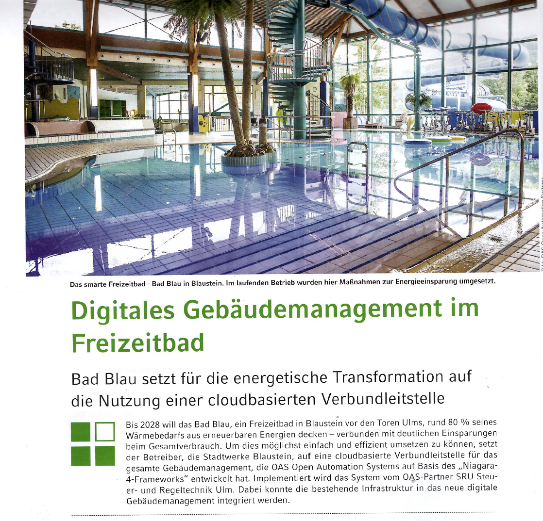 Bis 2028 will das Bad Blau, ein beliebtes Freizeitbad in Blaustein vor den Toren Ulms, rund 80 Prozent seines Wärmebedarfs aus erneuerbaren Energien decken - verbunden mit deutlichen Einsparungen beim Gesamtverbrauch. Um dies möglichst einfach und effizient umsetzen zu können, setzt der Betreiber, die Stadtwerke Blaustein, auf eine cloudbasierte Verbundleitstelle für das gesamte Gebäudemanagement, die OAS Open Automation Systems auf Basis des Niagara-4-Frameworks entwickelt hat.